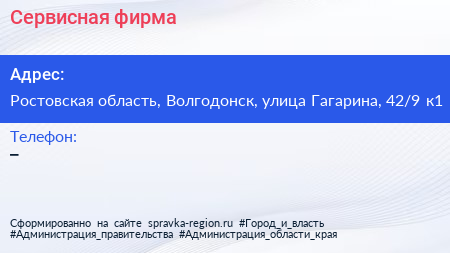Сервисная фирма по адресу Ростовская область, Волгодонск, улица Гагарина, 42/9 к1 в дальнейшем Организация, размещена в следующих категориях: