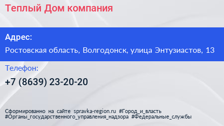 Теплый Дом, компания по адресу Ростовская область, Волгодонск, улица Энтузиастов, 13 в дальнейшем Организация, размещена в следующих категориях: