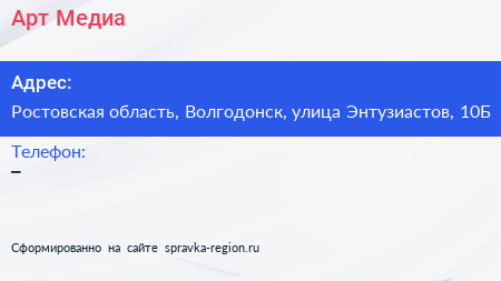 Арт-Медиа по адресу Ростовская область, Волгодонск, улица Энтузиастов, 10Б в дальнейшем Организация, размещена в следующих категориях: