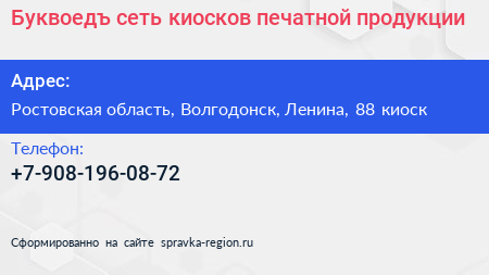 Буквоедъ, сеть киосков печатной продукции по адресу Ростовская область, Волгодонск, Ленина, 88 киоск в дальнейшем Организация, размещена в следующих категориях: