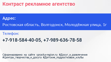 Контраст, рекламное агентство по адресу Ростовская область, Волгодонск, Молодёжная улица, 1г в дальнейшем Организация, размещена в следующих категориях: