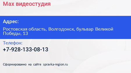 Max, видеостудия по адресу Ростовская область, Волгодонск, бульвар Великой Победы, 13 в дальнейшем Организация, размещена в следующих категориях: