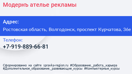 Модернъ, ателье рекламы по адресу Ростовская область, Волгодонск, проспект Курчатова, 36е в дальнейшем Организация, размещена в следующих категориях: