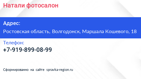 Натали, фотосалон по адресу Ростовская область, Волгодонск, Маршала Кошевого, 18 в дальнейшем Организация, размещена в следующих категориях: