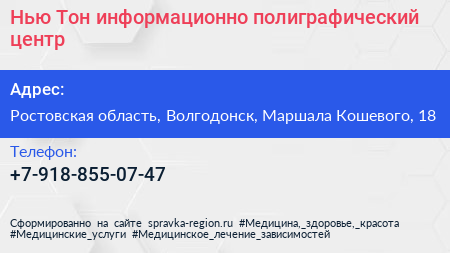Нью-Тон, информационно-полиграфический центр по адресу Ростовская область, Волгодонск, Маршала Кошевого, 18 в дальнейшем Организация, размещена в следующих категориях: