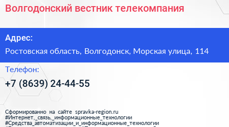 Волгодонский вестник, телекомпания по адресу Ростовская область, Волгодонск, Морская улица, 114 в дальнейшем Организация, размещена в следующих категориях: