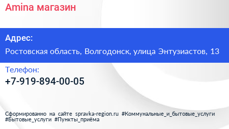 Amina, магазин по адресу Ростовская область, Волгодонск, улица Энтузиастов, 13 в дальнейшем Организация, размещена в следующих категориях: