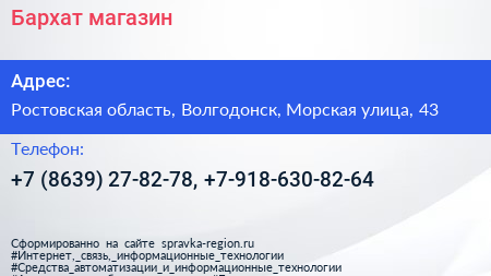 Бархат, магазин по адресу Ростовская область, Волгодонск, Морская улица, 43 в дальнейшем Организация, размещена в следующих категориях: