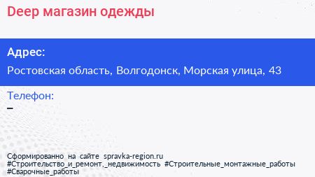 Deep, магазин одежды по адресу Ростовская область, Волгодонск, Морская улица, 43 в дальнейшем Организация, размещена в следующих категориях: