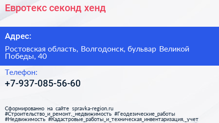 Евротекс, секонд-хенд по адресу Ростовская область, Волгодонск, бульвар Великой Победы, 40 в дальнейшем Организация, размещена в следующих категориях: