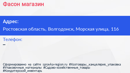 Фасон, магазин по адресу Ростовская область, Волгодонск, Морская улица, 116 в дальнейшем Организация, размещена в следующих категориях: