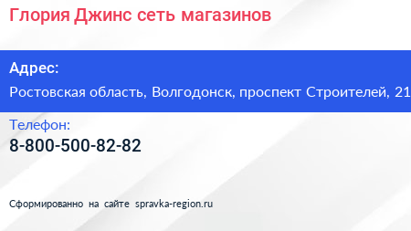 Глория Джинс, сеть магазинов по адресу Ростовская область, Волгодонск, проспект Строителей, 21 в дальнейшем Организация, размещена в следующих категориях: