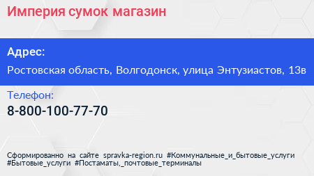 Империя сумок, магазин по адресу Ростовская область, Волгодонск, улица Энтузиастов, 13в в дальнейшем Организация, размещена в следующих категориях:
