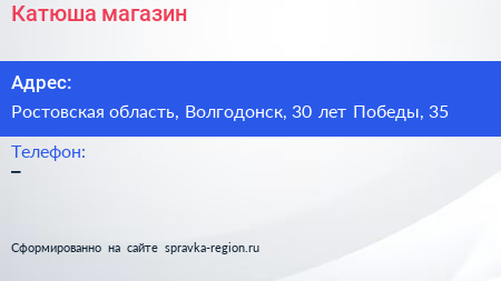 Катюша, магазин по адресу Ростовская область, Волгодонск, 30 лет Победы, 35 в дальнейшем Организация, размещена в следующих категориях: