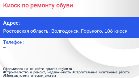 Киоск по ремонту обуви по адресу Ростовская область, Волгодонск, Горького, 186 киоск в дальнейшем Организация, размещена в следующих категориях: