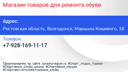 Магазин товаров для ремонта обуви по адресу Ростовская область, Волгодонск, Маршала Кошевого, 18 в дальнейшем Организация, размещена в следующих категориях: