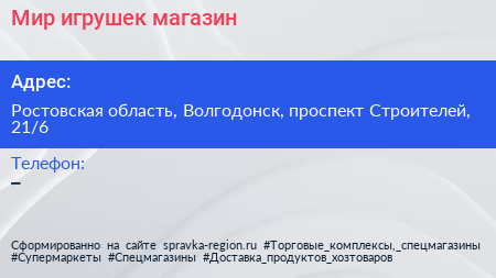 Мир игрушек, магазин по адресу Ростовская область, Волгодонск, проспект Строителей, 21/6 в дальнейшем Организация, размещена в следующих категориях: