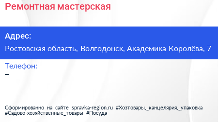 Ремонтная мастерская по адресу Ростовская область, Волгодонск, Академика Королёва, 7 в дальнейшем Организация, размещена в следующих категориях: