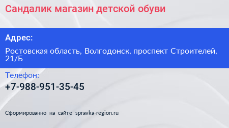 Сандалик, магазин детской обуви по адресу Ростовская область, Волгодонск, проспект Строителей, 21/Б в дальнейшем Организация, размещена в следующих категориях: