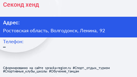 Секонд-хенд по адресу Ростовская область, Волгодонск, Ленина, 92 в дальнейшем Организация, размещена в следующих категориях: