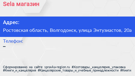 Sela, магазин по адресу Ростовская область, Волгодонск, улица Энтузиастов, 20а в дальнейшем Организация, размещена в следующих категориях: