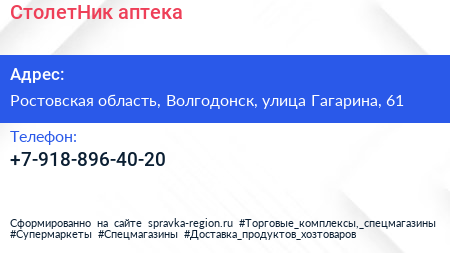 СтолетНик, аптека по адресу Ростовская область, Волгодонск, улица Гагарина, 61 в дальнейшем Организация, размещена в следующих категориях:
