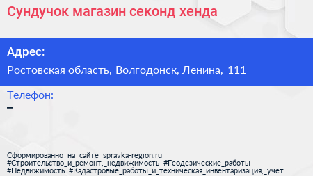 Сундучок, магазин секонд-хенда по адресу Ростовская область, Волгодонск, Ленина, 111 в дальнейшем Организация, размещена в следующих категориях: