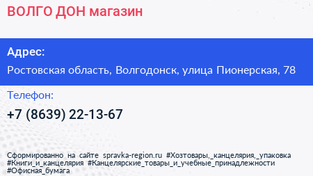 ВОЛГО-ДОН, магазин по адресу Ростовская область, Волгодонск, улица Пионерская, 78 в дальнейшем Организация, размещена в следующих категориях: