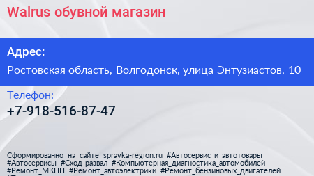 Walrus, обувной магазин по адресу Ростовская область, Волгодонск, улица Энтузиастов, 10 в дальнейшем Организация, размещена в следующих категориях: