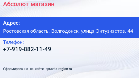 Абсолют, магазин по адресу Ростовская область, Волгодонск, улица Энтузиастов, 44 в дальнейшем Организация, размещена в следующих категориях: