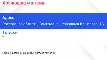 Хозяюшка, магазин по адресу Ростовская область, Волгодонск, Маршала Кошевого, 18 в дальнейшем Организация, размещена в следующих категориях: