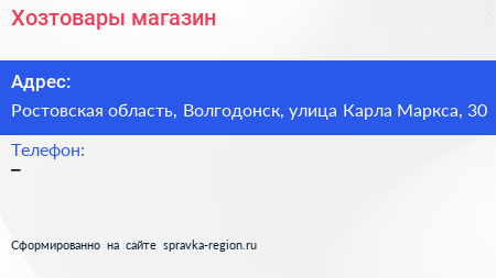 Хозтовары, магазин по адресу Ростовская область, Волгодонск, улица Карла Маркса, 30 в дальнейшем Организация, размещена в следующих категориях: