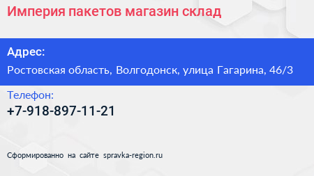 Империя пакетов, магазин-склад по адресу Ростовская область, Волгодонск, улица Гагарина, 46/3 в дальнейшем Организация, размещена в следующих категориях: