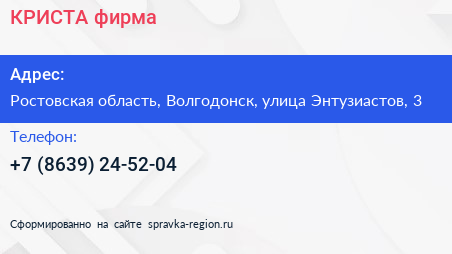 КРИСТА, фирма по адресу Ростовская область, Волгодонск, улица Энтузиастов, 3 в дальнейшем Организация, размещена в следующих категориях: