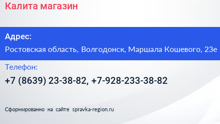 Калита, магазин по адресу Ростовская область, Волгодонск, Маршала Кошевого, 23е в дальнейшем Организация, размещена в следующих категориях: