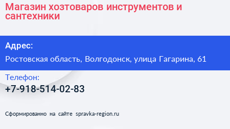 Магазин хозтоваров, инструментов и сантехники по адресу Ростовская область, Волгодонск, улица Гагарина, 61 в дальнейшем Организация, размещена в следующих категориях: