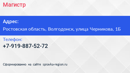Магистр по адресу Ростовская область, Волгодонск, улица Черникова, 1Б в дальнейшем Организация, размещена в следующих категориях: