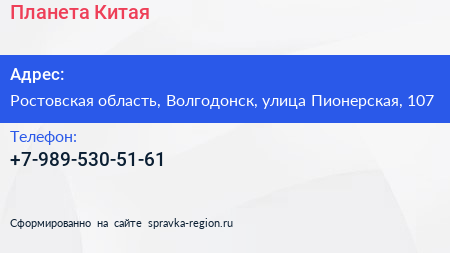 Планета Китая по адресу Ростовская область, Волгодонск, улица Пионерская, 107 в дальнейшем Организация, размещена в следующих категориях: