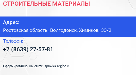 СТРОИТЕЛЬНЫЕ МАТЕРИАЛЫ по адресу Ростовская область, Волгодонск, Химиков, 30/2 в дальнейшем Организация, размещена в следующих категориях: