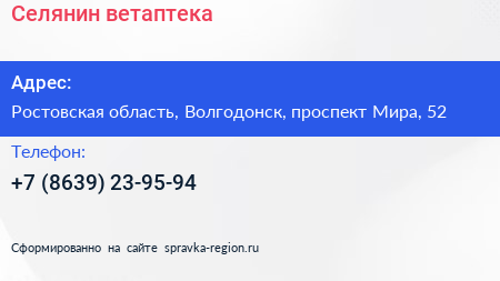 Селянин, ветаптека по адресу Ростовская область, Волгодонск, проспект Мира, 52 в дальнейшем Организация, размещена в следующих категориях: