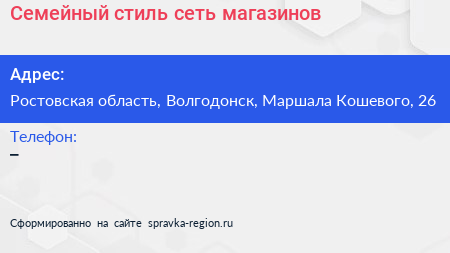 Семейный стиль, сеть магазинов по адресу Ростовская область, Волгодонск, Маршала Кошевого, 26 в дальнейшем Организация, размещена в следующих категориях: