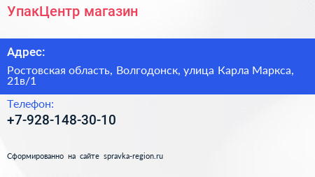 УпакЦентр, магазин по адресу Ростовская область, Волгодонск, улица Карла Маркса, 21в/1 в дальнейшем Организация, размещена в следующих категориях: