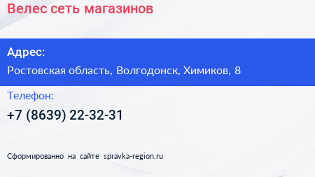 Велес, сеть магазинов по адресу Ростовская область, Волгодонск, Химиков, 8 в дальнейшем Организация, размещена в следующих категориях: