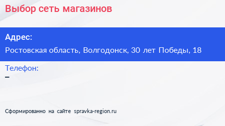 Выбор, сеть магазинов по адресу Ростовская область, Волгодонск, 30 лет Победы, 18 в дальнейшем Организация, размещена в следующих категориях: