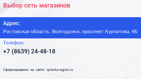 Выбор, сеть магазинов по адресу Ростовская область, Волгодонск, проспект Курчатова, 4Б в дальнейшем Организация, размещена в следующих категориях: