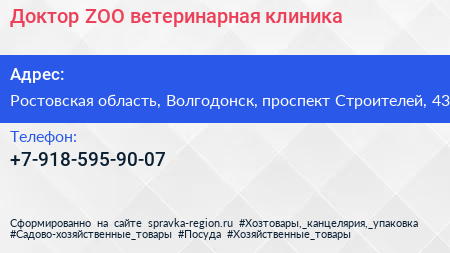 Доктор ZOO, ветеринарная клиника по адресу Ростовская область, Волгодонск, проспект Строителей, 43 в дальнейшем Организация, размещена в следующих категориях: