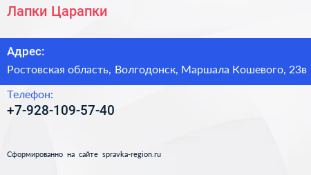 Лапки-Царапки по адресу Ростовская область, Волгодонск, Маршала Кошевого, 23в в дальнейшем Организация, размещена в следующих категориях:
