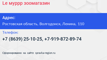 Le-муррр..., зоомагазин по адресу Ростовская область, Волгодонск, Ленина, 110 в дальнейшем Организация, размещена в следующих категориях: