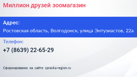 Миллион друзей, зоомагазин по адресу Ростовская область, Волгодонск, улица Энтузиастов, 22а в дальнейшем Организация, размещена в следующих категориях: