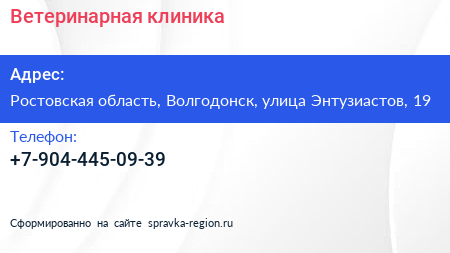 Ветеринарная клиника по адресу Ростовская область, Волгодонск, улица Энтузиастов, 19 в дальнейшем Организация, размещена в следующих категориях: